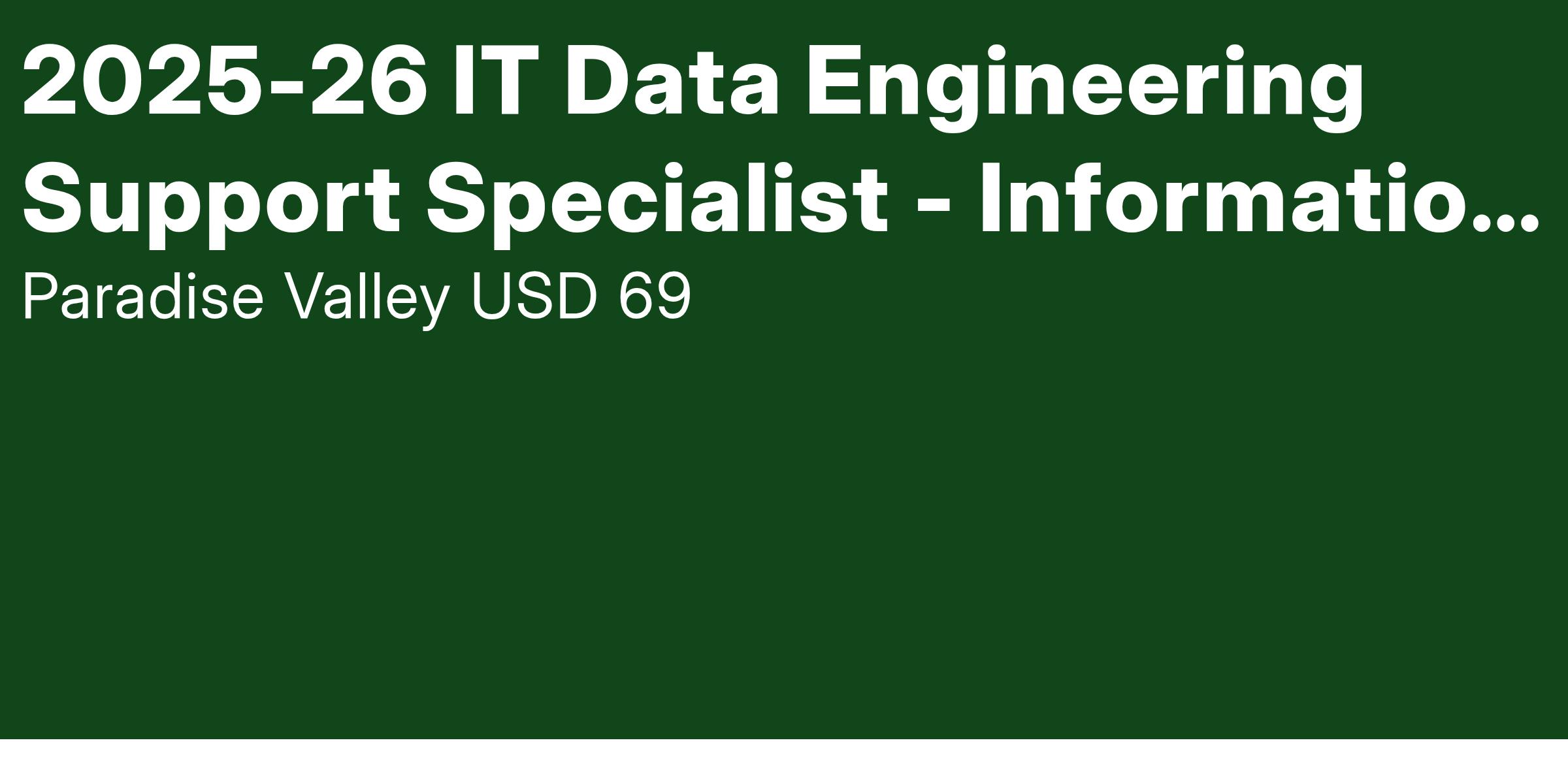 The role of the IT Data Engineering Support Specialist is to ensure the secure and efficient operation of the district's data systems, contributing to data-driven decision making, and supporting educational outcomes. This includes managing and securely maintaining databases, developing data pipelines, ensuring data integrity and security, and providing technical support to staff using various educational technology platforms and data analytics tools. This specialist collaborates with various departments to collect, analyze, and report on data related to student performance, operations, and compliance, ultimately enhancing the district's ability to utilize data for continuous improvement.