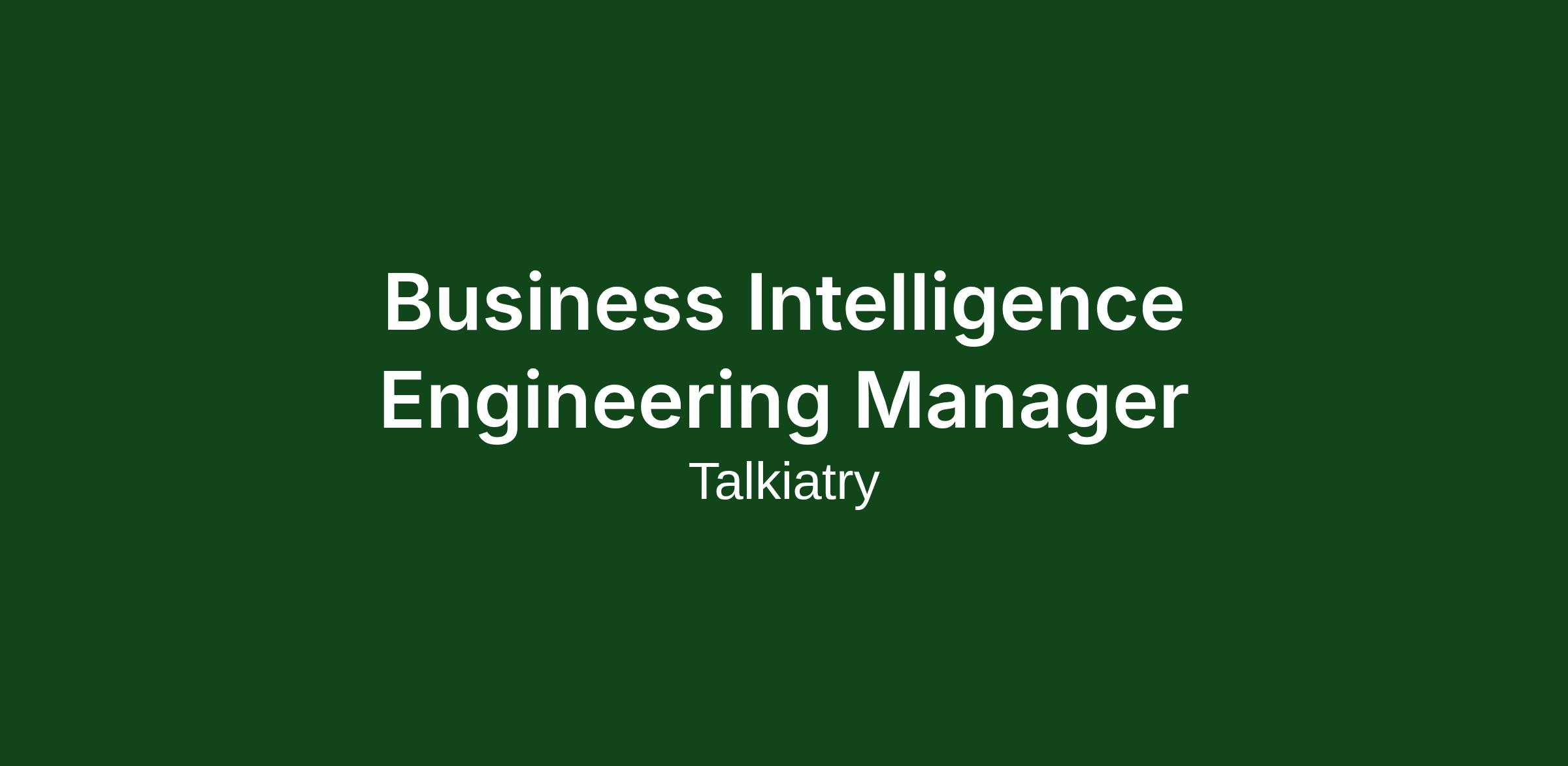 Talkiatry is seeking a strategic, hands-on Business Intelligence Engineering Manager to lead our growing BI Engineering team. This leader plays a critical role in advancing Talkiatry’s data strategy by guiding the technical direction and delivery of our BI and analytics systems, with a focus on scalable, reliable self-service analytics that support informed decision-making and follow modern analytics engineering best practices. You will manage a team of five BI professionals and partner closely with Engineering, Product, Operations, Marketing, and Finance to ensure data is accessible, actionable, and aligned with our mission of transforming mental health care.