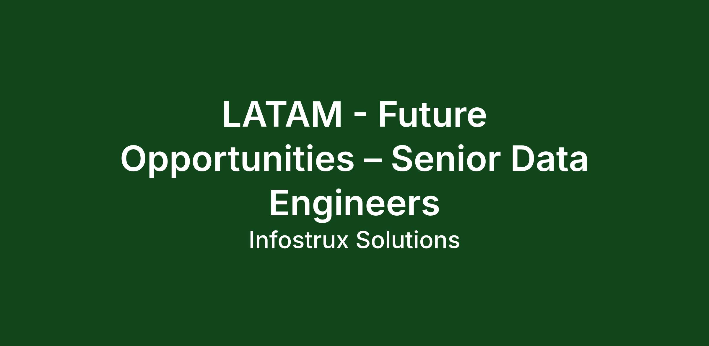 We're continuously looking for talented individuals based in Latin America to join our growing, fully remote team. At Infostrux, our team members have the flexibility to be direct contractors based in Latin America, including Argentina, Brazil, Chile, Costa Rica, El Salvador, Paraguay, Uruguay, and beyond; wherever suits you best.