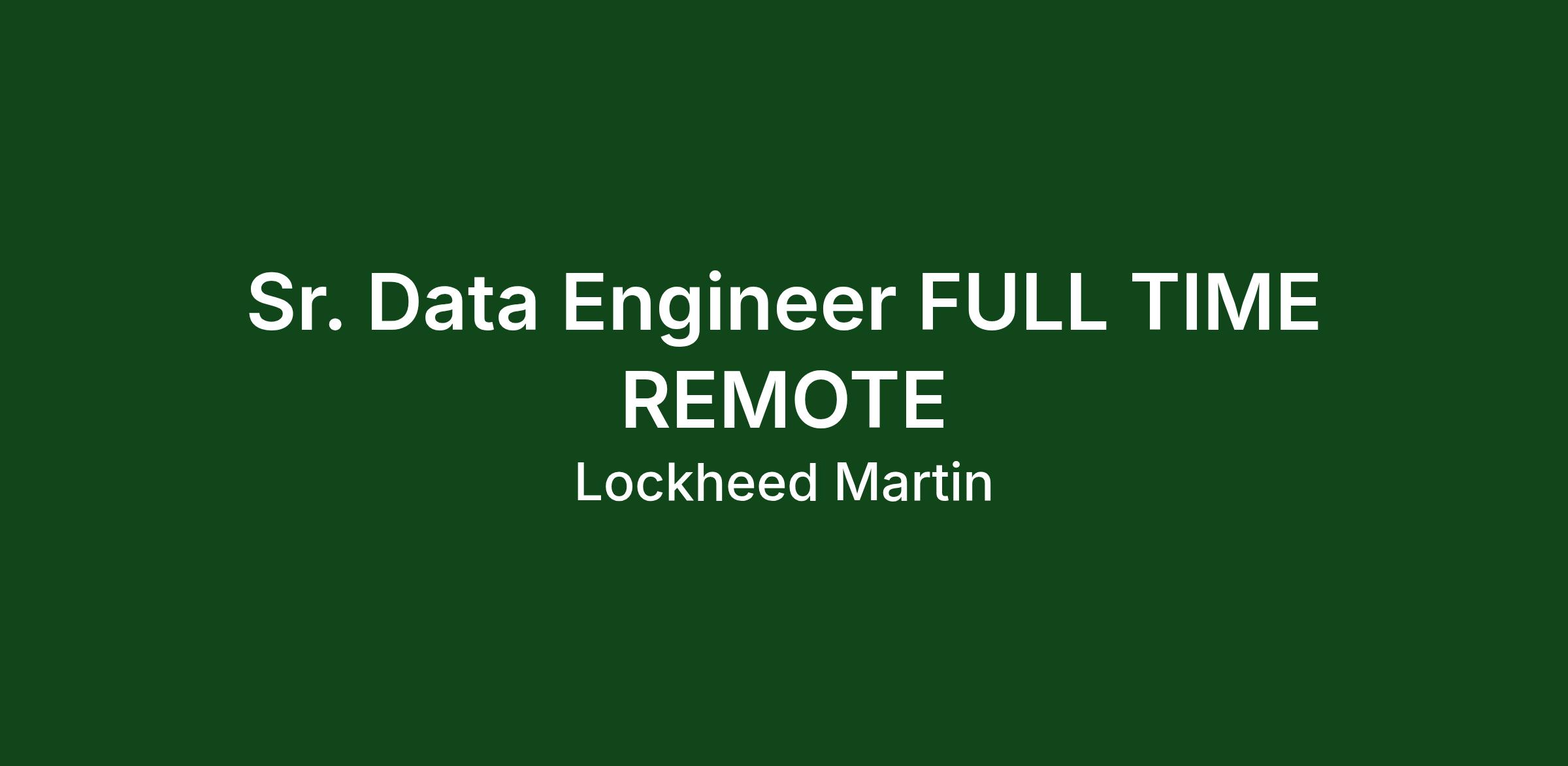 Lockheed Martin’s Rotary and Mission Systems’ C4ISR team is looking for a proven and experienced Data Engineer to support a one-of-a-kind project Cross Business Area campaign that exemplifies our commitment to our OneLM Strategy.